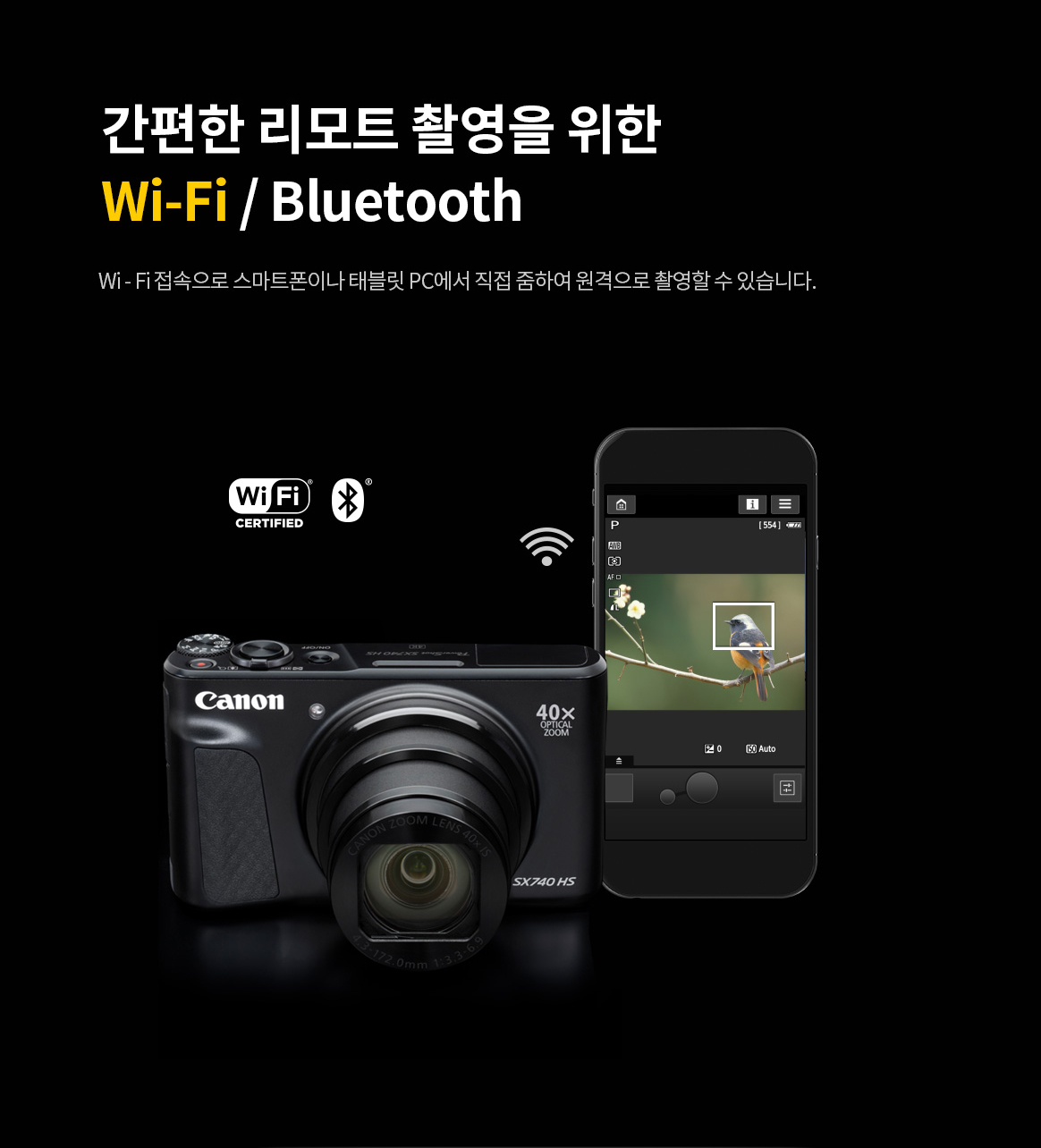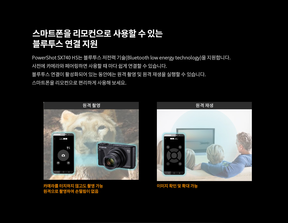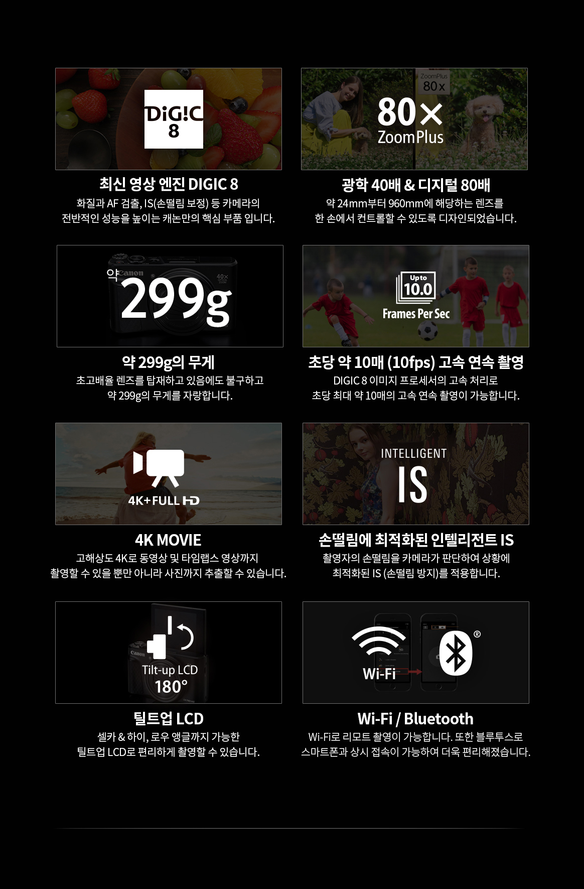 | 주요 사양 | DIGIC 8, 광학 약 40배, 디지털 80배, 초당 약 10매의 고속연속촬영, 4K MOVIE, 손떨림방지, 틸트업 LCD, Wi-Fi, NFC, Bluetooth |