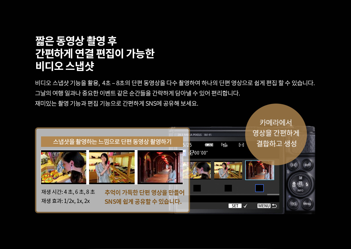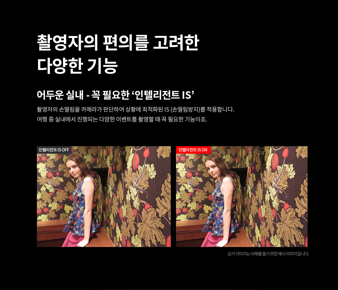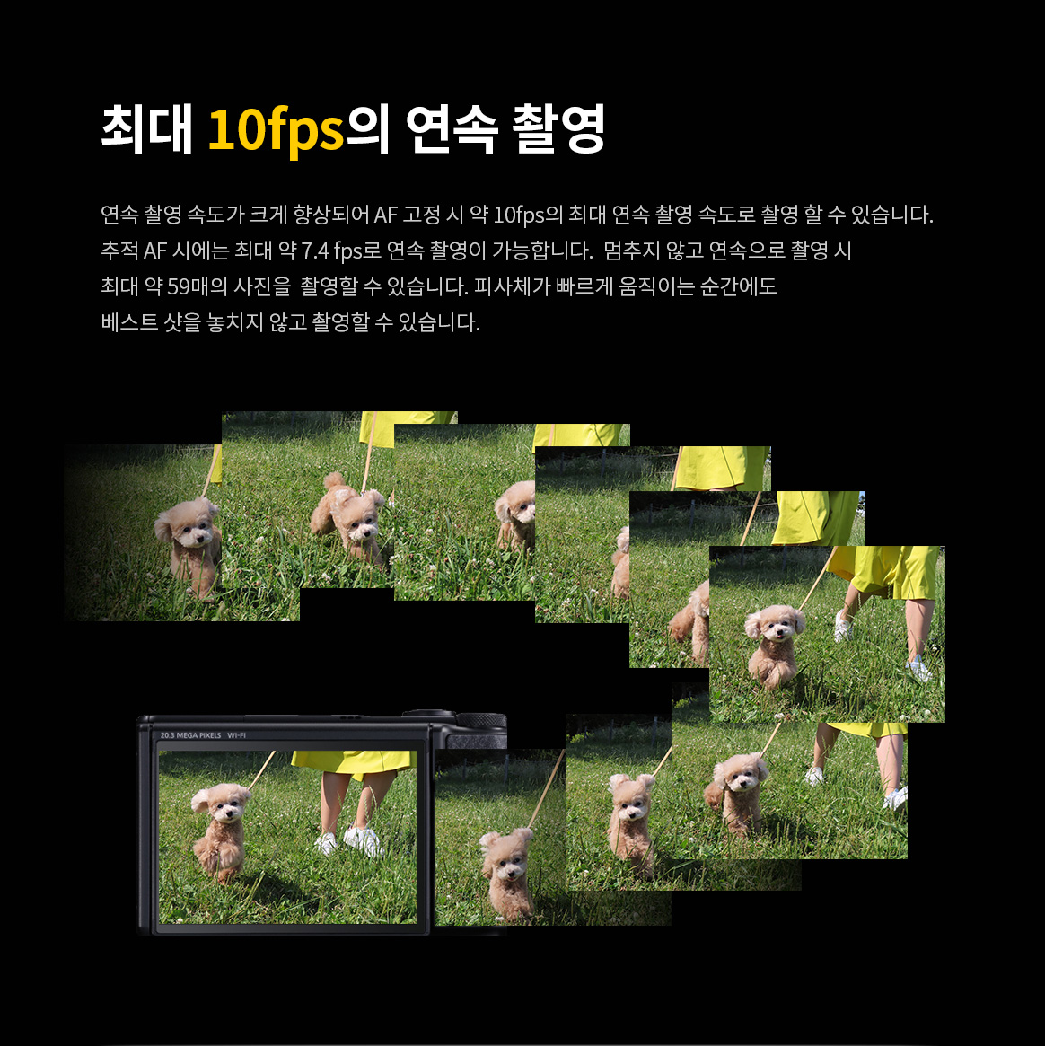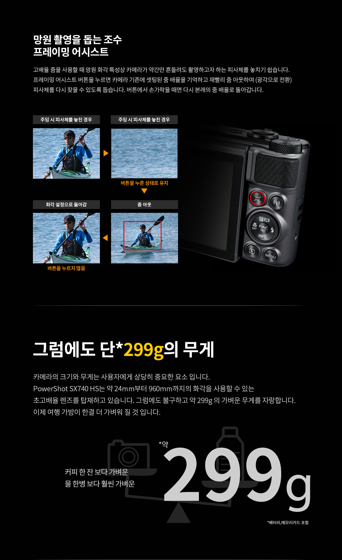 | 크기, 무게 | 크기 및 무게 (CIPA 규격) 크기 약 110.1 (W) x 63.8 (H) x 39.9 (D) mm 무게 약 299g (배터리 팩, 메모리 카드 포함), 약 275g(카메라 바디만) |